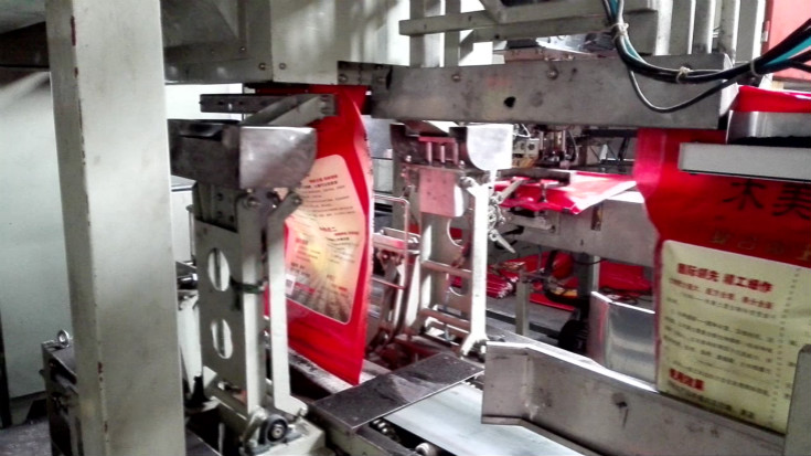 本圖片為全自動包裝秤中的自動折邊縫口機對包裝袋進行自動折邊縫口作業。